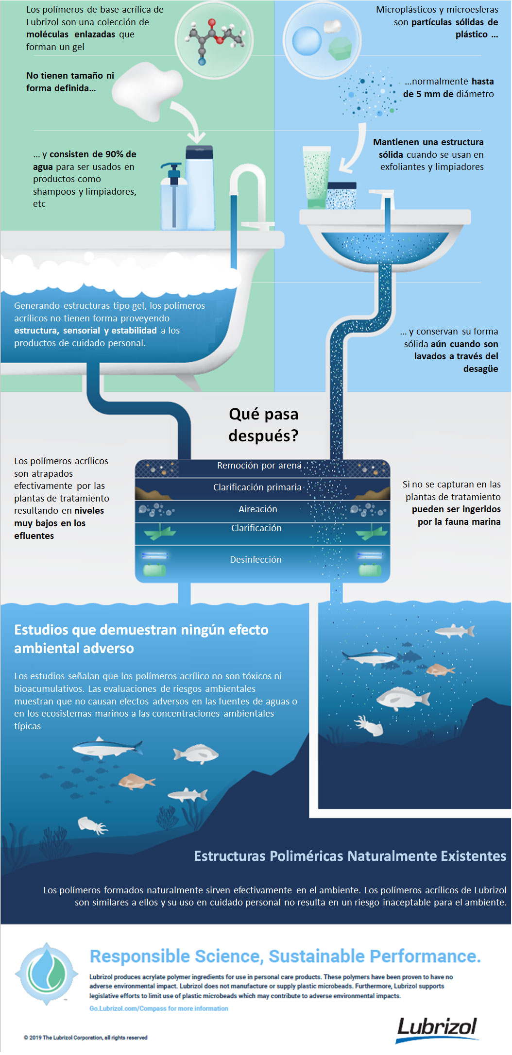 Lubrizol fabrica polímeros acrílicos para uso en productos de cuidado personal . En el debate alrededor de los desperdicios plásticos de en el medio ambiente marino, es importante entender la diferencia entre los polímeros acrílicos y los microplásticos o "microbeads". Los polímeros de Lubrizol no son microplásticos ni microcápsulas