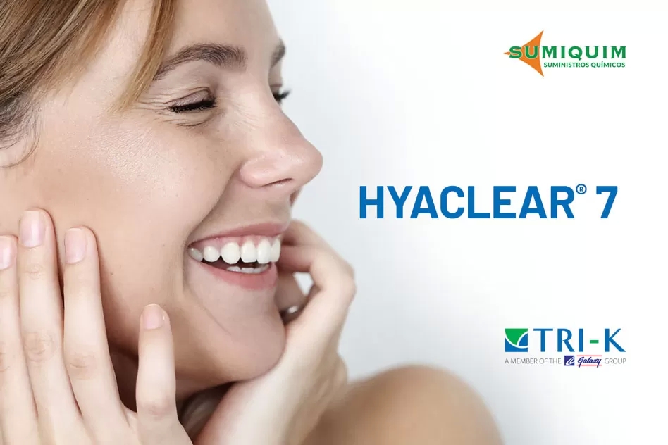 Hoy queremos presentarte un nuevo lanzamiento de nuestro representado Tri-K llamado Hyaclear® 7 el cual está diseñado con una relación optimizada de 7 pesos moleculares de ácido hialurónico.